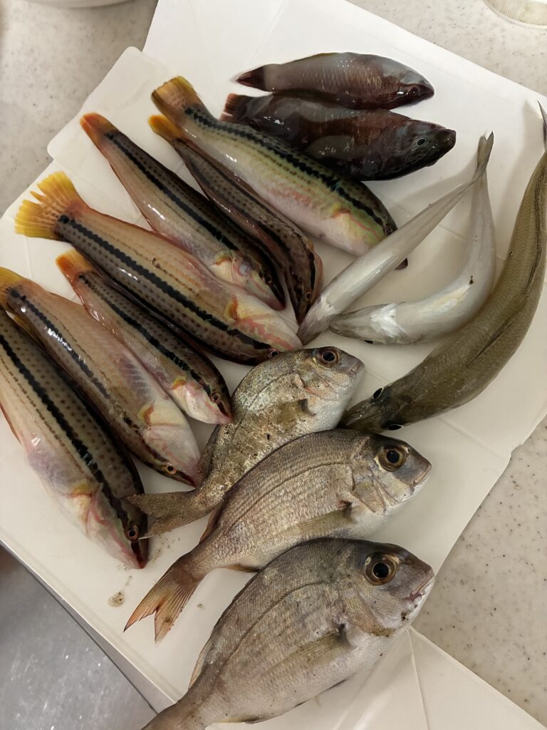 釣果はベラ7匹、子鯛3匹、キス3匹。あと、初めてみたなんちゃらベラ2匹。