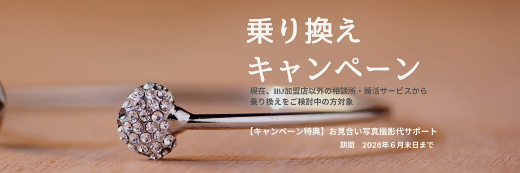 現在、IBJ加盟店以外の相談所・婚活サービスから乗り換えをご検討中の方を対象に期間限定の乗り換えキャンペーンを実施しています。(2026年6月末日まで)